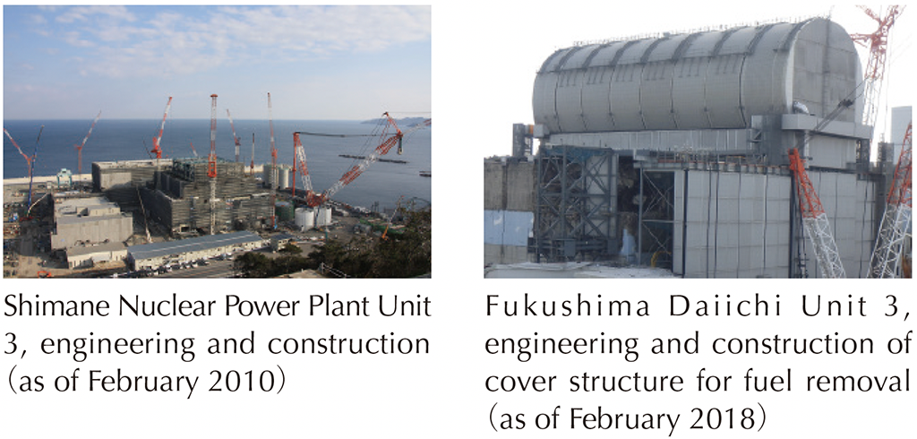 Kajima has been constructing nuclear plants since the 1950s. Using those experiences and innovative ideas, Kajima has developed the technologies to build highquality structures safely in a very short term “Large – Scale Modular Construction Method”,“ All-Weather Construction Method”, and so on.